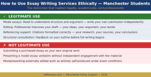 Using editing services: A professional reviews and improves your own draft. The ideas, structure, and argument are yours. The edit improves expression and catches errors. This is identical in principle to a lecturer reading a draft and giving feedback — which universities actively encourage. Students in London can read our essay writing services London guide for a parallel breakdown of how this works at UCL, LSE, and King’s.