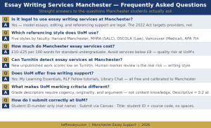 Most essay writing services Manchester are generic providers staffed by writers with no particular knowledge of Manchester’s institutional framework. They produce work written to general UK academic standards, not to the specific critical analysis expectations and referencing precision that Manchester markers apply.