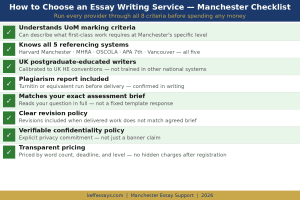 A legitimate essay writing service for Manchester students must meet eight criteria: understanding of UoM marking criteria, knowledge of all five faculty referencing systems, UK postgraduate-educated writers, plagiarism check included, ability to match exact assessment briefs, a revision policy, a verifiable confidentiality policy, and transparent pricing by word count and academic level.