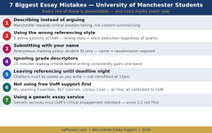 The seven most common essay writing mistakes among University of Manchester students are: describing instead of arguing, using the wrong referencing style, submitting with a name instead of a student ID, ignoring the grade descriptors, leaving referencing until the deadline night, not using the University’s free support first, and using a generic service that does not understand Manchester’s institutional standards.