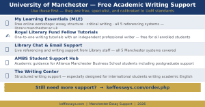 Every student should exhaust these resources before considering any external paid support. They exist precisely because academic writing support improves outcomes, and they are calibrated specifically to Manchester’s marking standards.